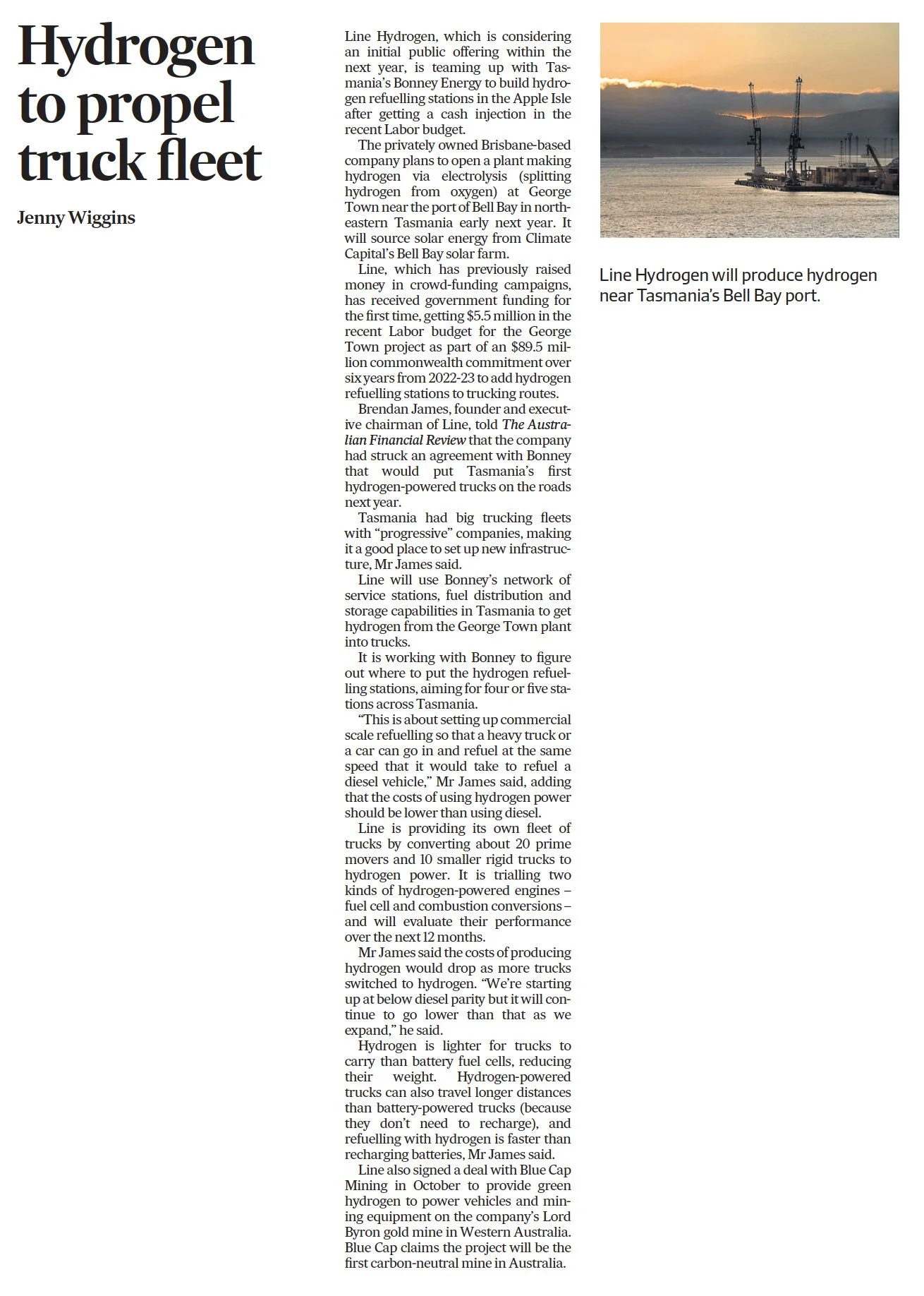 Brendan James, founder and executive chairman of Line, told The Australian Financial Review that the company had struck an agreement with Bonney that would put Tasmania's first hydrogen-powered trucks on the roads next year.